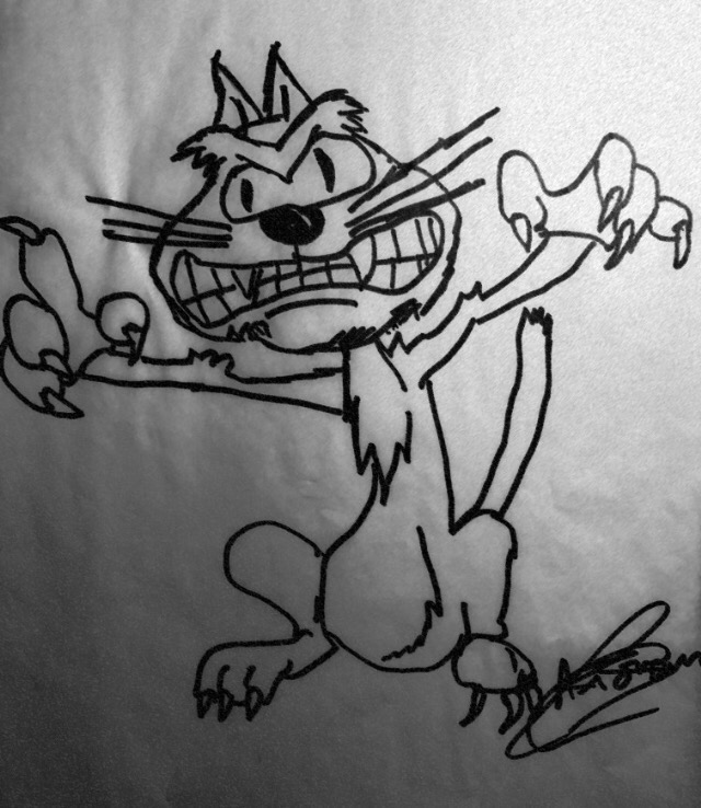 She leaped from the table and landed directly on Mrs. Robin’s head. She immediately extended her claws on all four feet simultaneously and plunged them into poor Mrs. Robin’s scalp.