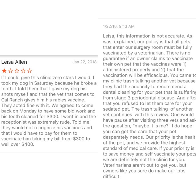 Unfortunately, occasional negative reviews are posted that reflect a lack of respect for our high standard of care and commitment to pets. If you appreciate our individualized care, I encourage you to provide a positive google review.