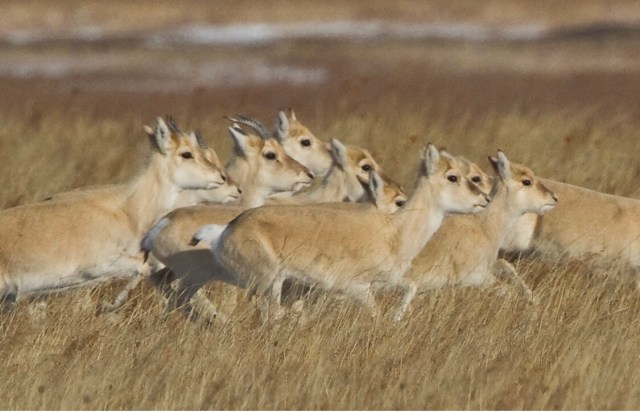 Herds of as many as 100,000 gazelle are commonly seen across the steppe with larger congregations occasionally reported. During the two weeks of the calving season, up to 400,000 females will gather, and the vast majority will give birth within a four-day period. This is a unique phenomenon. This is thought to be a strategy to reduce neonatal death loss due to predation. This synchronicity also ensures that the young will grow big enough by winter to survive the harsh weather.