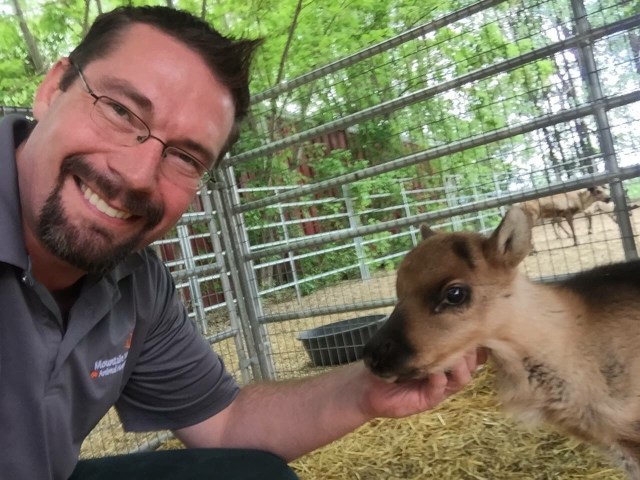 I arrived just in time to witness the female reindeer, named Mischief, begin her labor. I was able to then help deliver a small female calf. The baby was so fragile! It was a solid jet black. I remember thinking that was such an unusual color when compared to her mother. The calf had difficulties initially. I had to administer medication to help with heart rate and for several days, the mother had to be milked and the calf had to be fed with a bottle. Mother also had difficulties after the birth. She had retained the placenta and required several days of medical intervention. Finally, after nearly a week, mother and baby began to thrive. We named the baby Disney.