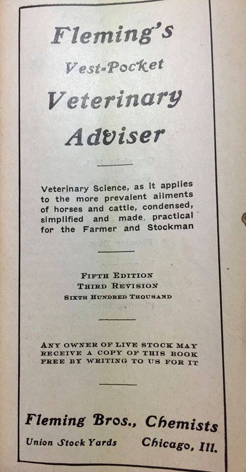 Information came in the form of newspapers and books. Knowledge was a valuable asset that would set certain farmers apart. When information was available, these farmers were open to reading and learning. It was during this time that LW Peterson acquired a new book called, Fleming’s Vest-Pocket Veterinary Adviser.