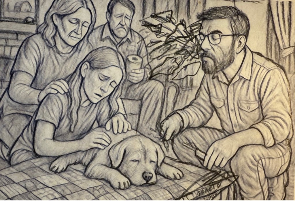 When I arrived, Millie lay on a patchwork quilt in the living room. The air carried the faint scent of lavender and something softer—grief, maybe, or memory. The mother knelt close, stroking Millie’s ears with the kind of tenderness only time can teach. The father stood off to the side, swallowing hard. And the teenage daughter cradled Millie’s head in her lap, her face pale, her eyes fixed on the dog that had always been there.